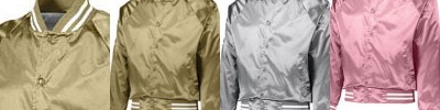 Outer Shell: 100% nylon satin ; Liner: 100% polyester brushed tricot; Water-resistant; Snap front; Raglan sleeves for maximum mobility ; Striped rib-knit collar cuffs and bottom band ; Front pockets; Tear away label;