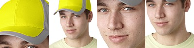 100% polyester; Navy: 100% cotton twill; 6-panel; Constructed; Mid-profile; High-visibility color crown with reflective grey inserts on side panels and trim on visor; Reflective fabric on self-adhesive back strap; Matching grey under visor and sweatband; Self-adhesive closure;