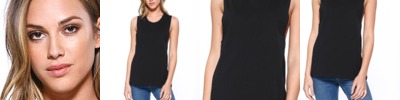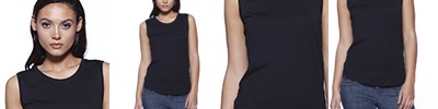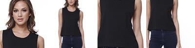 4.3 oz., 52% cotton 48% polyester, 30 singles; Ultra-fine cotton blend; Fashion fit; Side seams; Scoop neck 1x1 rib sleeveless cuffs; Tear-away label; Made in a w.r.a.p. certified factory;