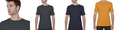 4.5 oz., 100% polyester; Moisture management jersey; Ribbed collar; Taped shoulder to shoulder with EasyTear™ label; Double-needle hemmed sleeves and bottom;