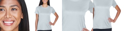 4 oz., 100% micro-polyester; Moisture-wicking; UPF 30+ protection; Feminine fit; Double-needle sleeves and bottom hem; Open cuffs; Transitioning from heat-seal label to tear away label. Inventory may be mixed;